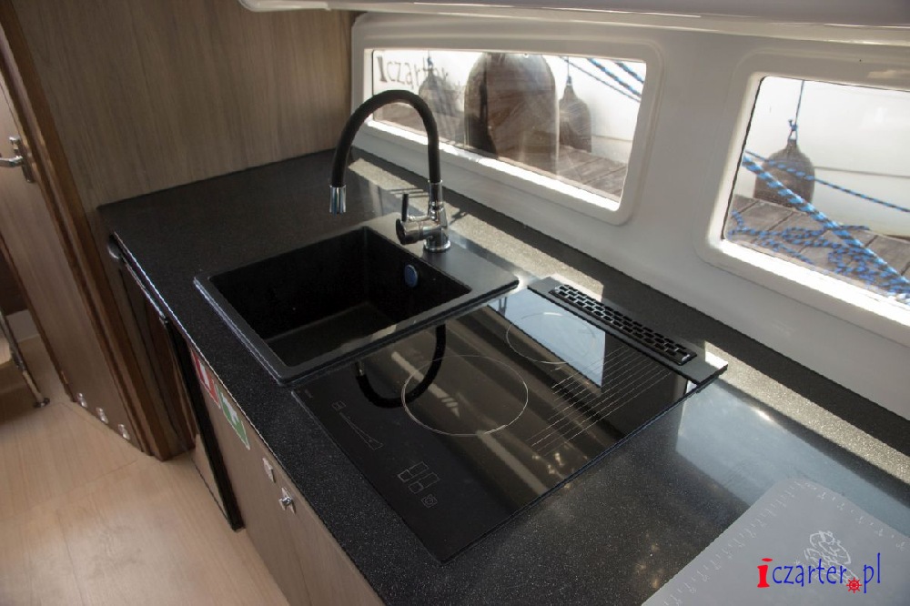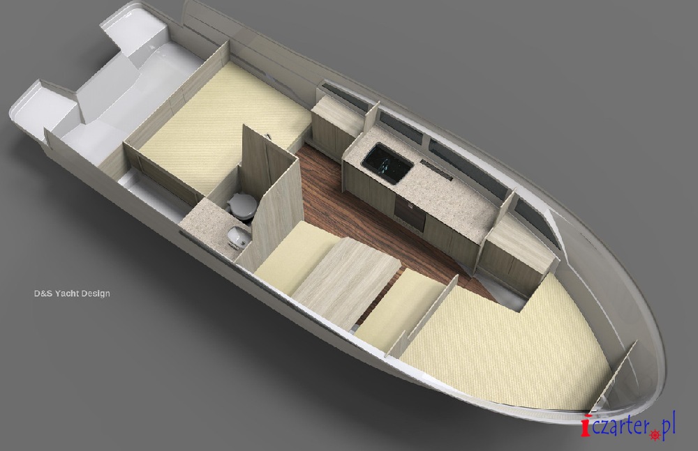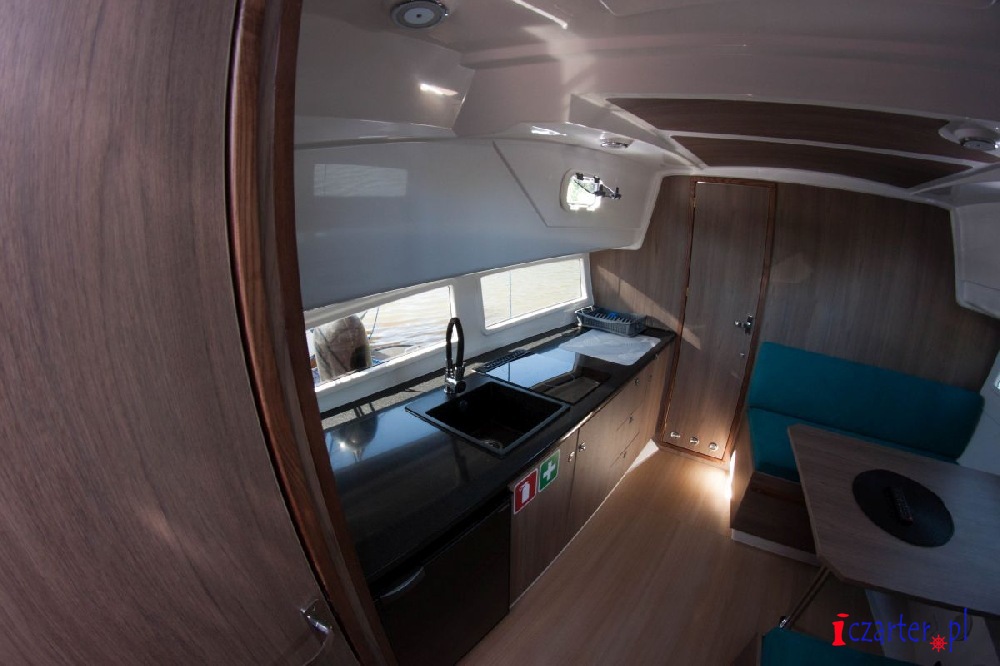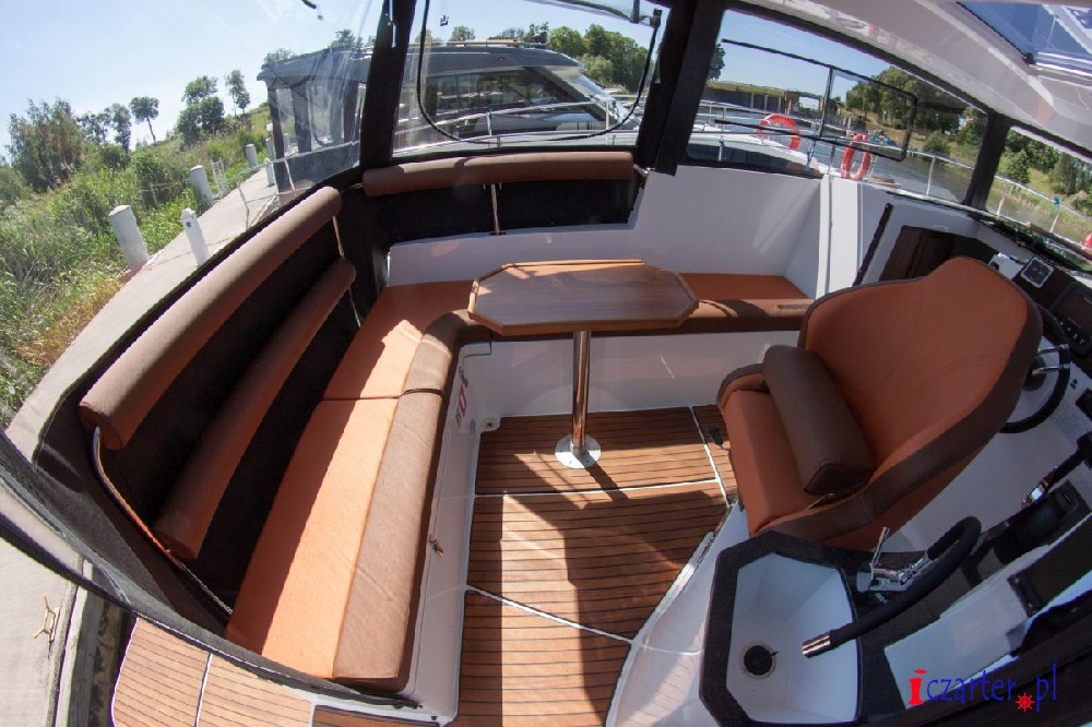 Oferowana do czarteru na Pętli Żuław jednostka została bardzo dobrze wyposażona. Zabudowa jachtu Neon 990 została wykonana z płyty HPL w dekorze Teak Laos w wersji dwu kabinowej. W ramach zabudowy zostały wykonane dwie zamykane dwuosobowe kabiny sypialne, przestronna i dobrze oświetlona mesa z aneksem kuchennym. Kambuz wykonano na całej długości lewej burty mesy, z dużym blatem roboczym z corianu. Pod blatem zamontowano dużą lodówkę o pojemności 85L, w centralnej części blatu zamykaną kuchenkę gazową ze zintegrowanym zlewem marki Dometic. Pod blatem znajdują się także liczne szafki i szuflady. Łazienka jest przestronna, z pełną wysokością stania i możliwością obrócenia. W łazience zamontowano duży zlew, prysznic oraz toaletę elektryczną. Na jachcie zamontowano duży zbiornik na wodę pitną o pojemności 170 litrów oraz bojler elektryczny o pojemności 30 litrów. Ciepła woda jest rozprowadzona do wylewek w łazience, kuchni, kokpicie oraz do prysznica rufowego. Przyjemną temperaturę w chłodne dni zapewni ogrzewanie olejowe typu Webasto o mocy 4 kw. Cały kokpit jachtu jest zadaszony z dużymi, panoramicznymi pionowymi szybami. Do dachu jednostki zamontowano podwijane cabrio chroniące załogę przed złą pogodą z funkcją moskitiery. W kokpicie usytuowano kambuz ze zlewem oraz wylewką. Większość kokpitu stanowi duża kanapa w kształcie litery „L” na której zmieści się 6 osobowa załoga, w rogu kanapy zamontowano mały stolik kawowy. Dziób jachtu Neon 990 to idealne miejsce do zażywania kąpieli słonecznych – nadbudówka jest wyłożona wygodnymi materacami, skąd można podziwiać widoki podczas rejsu po Zalewie Wiślanym.