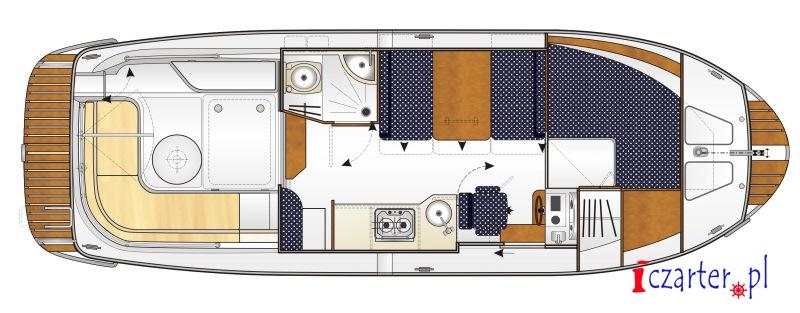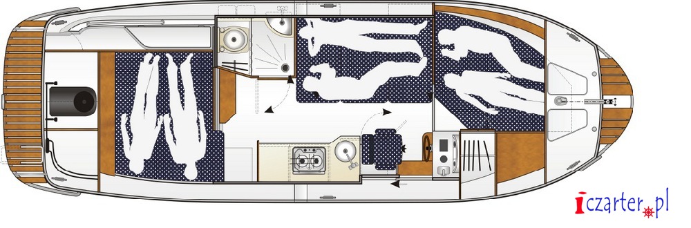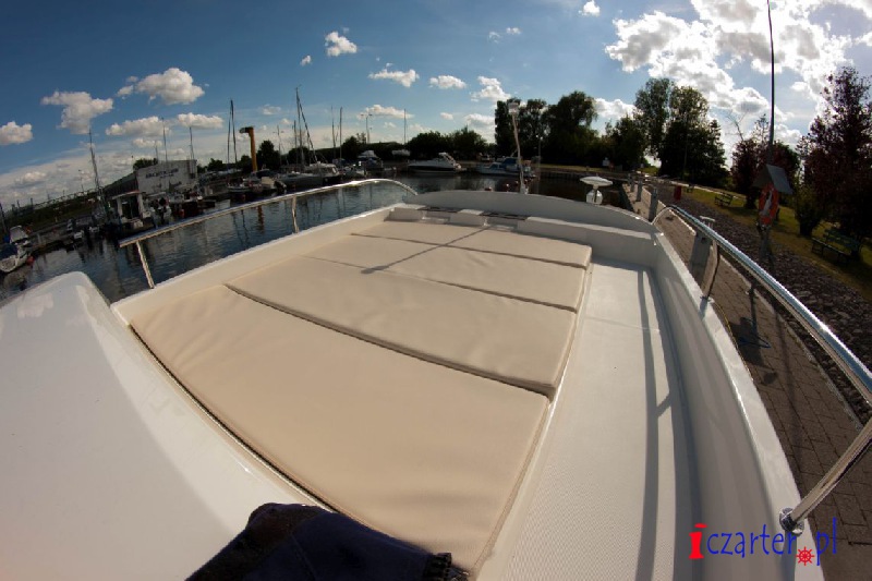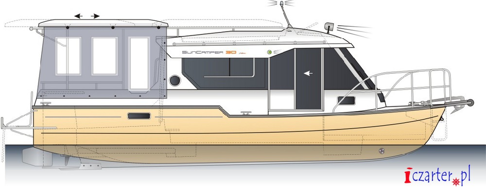 Barka Suncamper 30 to nowoczesna jednostka przeznaczona do rekreacyjnego pływania po jeziorach, rzekach i kanałach, idealna na rzeki Pętli Żuławskiej oraz na Zalew Wiślany. Na tle innych jachtów motorowych Suncamper 30 wyróżnia się ciekawą sylwetką, doskonałym układem wnętrza. Jacht motorowy Suncamper 30 posiada dwu kabinową zabudowe, bogate wyposażenie wnętrza, dużą przestronną kuchnie oraz łazienke. Przeszklone, panoramiczne okna jednostki umożliwiają podziwianie uroków otaczającej nas przyrody. Pomimo takiej zabudowy Sucnamper 30 jest bardzo dobrze wentylowany. Po otworzeniu przesówanych drzwi rufowych mesa z kokpitem tworzy jedną bardzo dużą przestrzeń, przed słońcem ochrania załogę w kokpicie daszek, dodatkowo w razie złej pogody kokpit jest zapinany cabrio. Fani słonecznych kąpieli do dyspozycji mają pokład słoneczny który znajduje się na dachu jednostki (wejście od rufy po drabince). Suncamper 30 to bardzo wygodna barka, idealna do czarteru na Pętli Żuławskiej i Zalewie Wiślanym. Niewielkie zanurzenie na dziobie pozwala na bardzo łatwe podejście praktycznie do każdego brzegu. Dzięki silnikowi doczepnemu Yamahay o mocy 30 Km,. jednostka charakteryzuje się bardzo dobrą manewrowością, dziobowy ster strumieniowy ułatwia wszelkie manewry w portach. Jacht Suncamper 30 to idealna jednostka na rodzinny rejs po Pętli Żuławskiej.