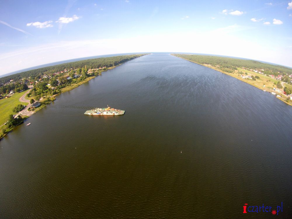 W odległości około 3.5 Km na północ od śluzy Przegalina, na wysokości Świbna i Mikoszewa kursuje linowy prom do przewozu osób i samochodów. Leżąca na dnie rzeki lina podnosi się i napręża od promu do brzegu, do którego prom płynie. Kategorycznie nie wolno przepływać przed płynącym promem, możliwe jest przejście z jego rufy, ale w bardzo dużej odległości. Teoretycznie obsługa promu powinna zaczekać, jeżeli zauważy prom płynący w dół rzeki (od Przegaliny w kierunku ujścia Wisły), prom ma zaś pierwszeństwo przed jednostkami płynącymi w górę rzeki (od ujścia do Przegaliny). Najlepiej jednak jest zaczekać aż prom dopłynie do brzegu.